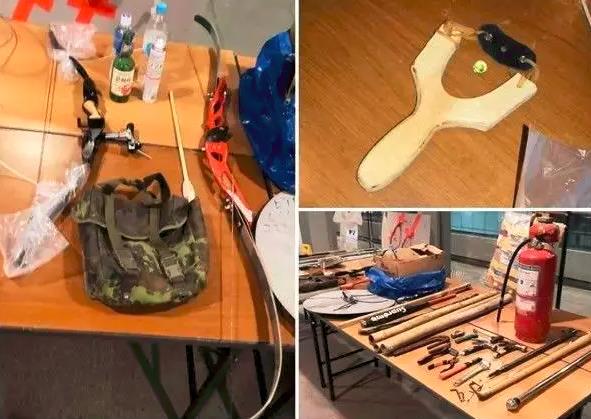 警方在示威现场缴获的弓箭(左图)、弹弓(右上)、灭火筒和棍棒等(右下)。