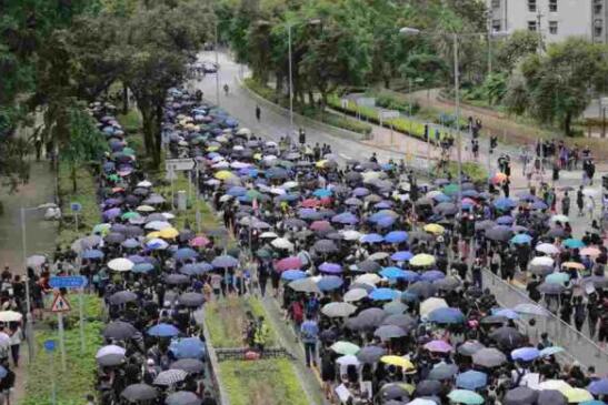 2点30分,游行队伍正式出发,人群经过将军澳警署附近时,大量黑衣人涌上机动车道路,将附近交通完全堵塞。示威者还举起港独旗帜以及美国星条旗。