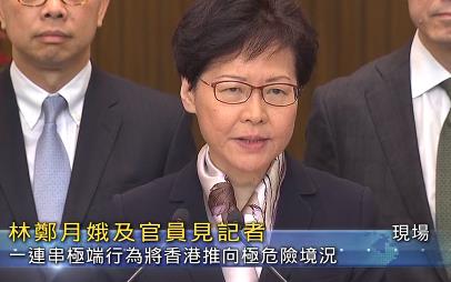 林郑月娥表示,香港一直是世界上最安全的城市之一,但在过去的两周,暴力破坏行为不断升级,有人堵塞主要干道,围堵、破坏警署,损毁公物,甚至有一小撮极端暴力分子纵火、扔汽油弹、制造炸弹、藏有大量攻击性武器。
