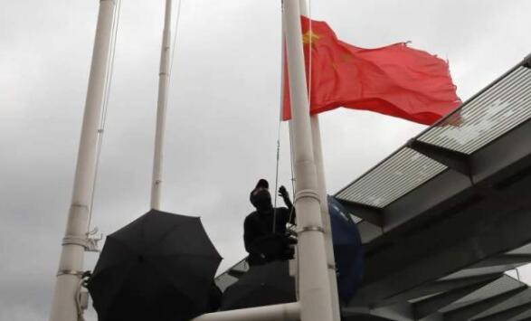 当天下午17时40分左右,更有数名着黑衣的激进分子拥至海港城外的旗杆底座,用雨伞“掩护”其中一人升上“港独”旗帜,随后竟拆下中华人民共和国国旗,并将其掷入海中。