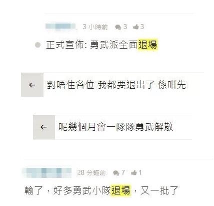 据香港新闻网7日报道,从今日凌晨开始,一股“悲观”情绪开始弥漫,并且迅速传遍整个社交网络——“勇武已经全面退场”。0点52分,一位疑似“勇武”在脸书发文《致呢(这)半年慨(的)手足》,他在文中宣布,正式退出“勇武派”的“火炬小队”。这只是“勇武退场”的其中一个帖子,事实上,截止到今天下午4点,暴徒聚集的“连登论坛”,一天之内关于“退场”的讨论帖就超过100篇。整个“连登论坛”,悲观气氛在弥漫……