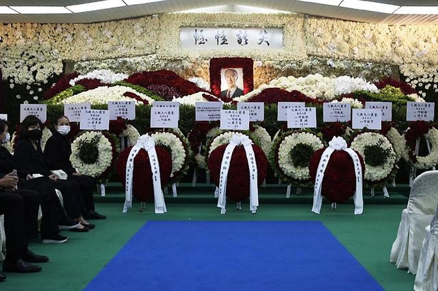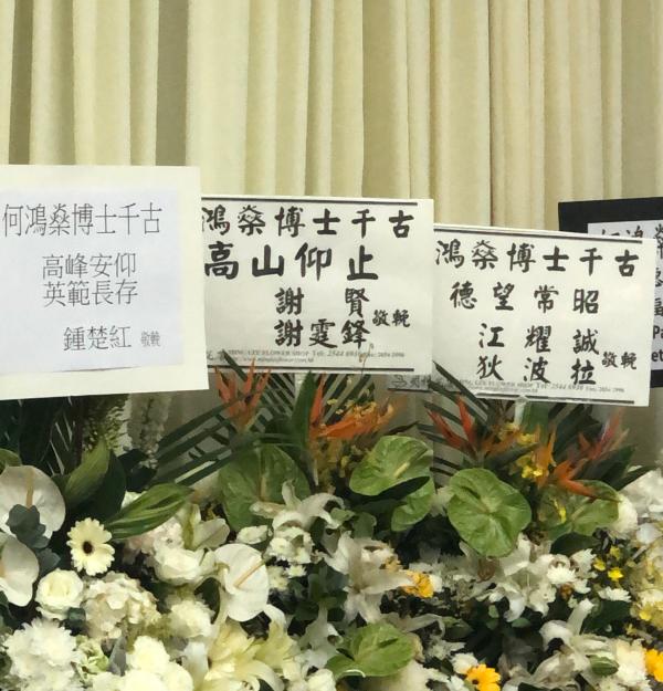 何鴻燊三位太太的心形玫瑰花圈放置在靈堂中央,二太藍瓊纓以“白頭永訣”致上,三太陳婉珍以“痛斷琴弦”致哀,四太梁安琪則以“情意難忘”傾訴不捨之情,後方擺有一眾子女獻上的花圈。