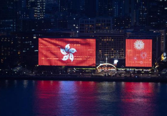 “七一”建党节和香港回归日,九龙半岛建筑外亮起香港特区区旗。图片来源:澎湃影像